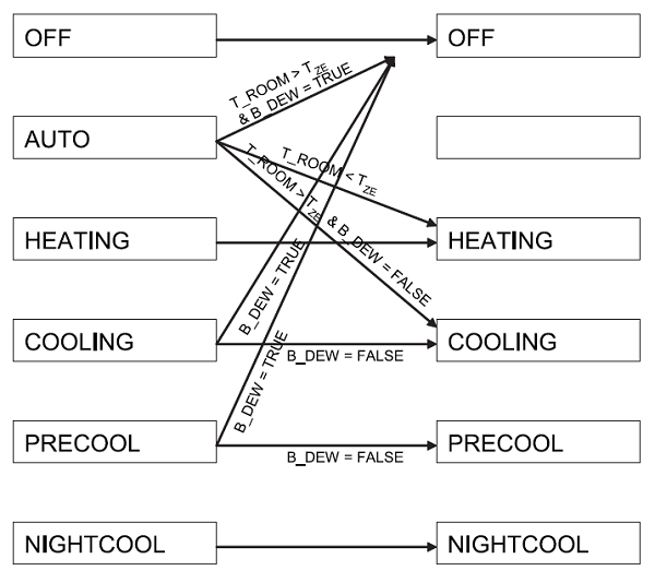 Apart from the selection of a control function by the operator (e. g. via a time program), a change of function can also be triggered by the dewpoint being reached in cooling mode. In this case, the controller remains inactive (OFF). If automatic room-by-room changeover between heating and cooling is permissible (e. g. with four-pipe systems), and is selected by the operator (F_BMS = AUTO), the function decides on changing the active function (HEATING or COOLING) depending on the current setpoints (T_SETPT) and the room temperature (T_ROOM). In doing so, the function must make sure that, for systems having just one joint register or one joint area for heating and cooling purposes, changeover takes place via the OFF function, after an appropriate holding time to allow any open valves to close."[1, section 6.5.22, p. 70 - 72]