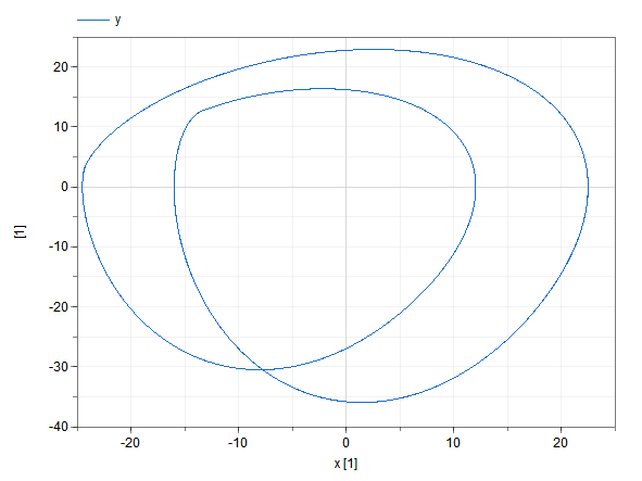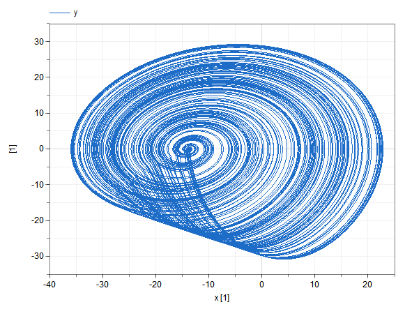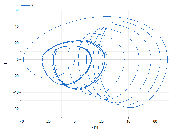 The results meant for plotting are labeled. Normally plot one result variable versus the other, in this example y vs. x and / or z vs. x. Of course the initial transient depends on the initial conditions.