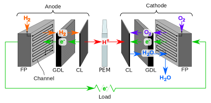 The proton exchange membrane (PEM) prevents electronic transport; therefore, electrons must pass through an external load to sustain the net reaction.