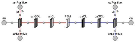 Figure 1 shows the seven primary layers of a typical PEMFC, which are also the components of the fuel cell model shown in Figure 2. Fluid enters and exits the cell through channels in the flow plates (FPs). It spreads through the gas diffusion diffusion layers (GDLs) and reacts in the catalyst layers (CLs) according to the following electrochemical equations: