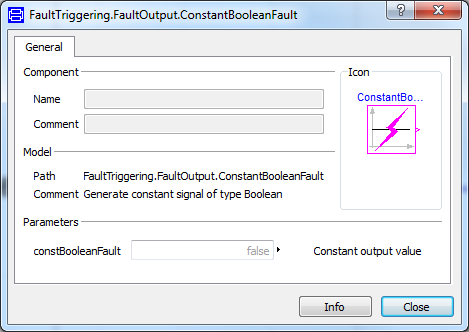 In the boolean parameter value block, it is possible to turn the fault on or off (default=off). IMPORTANT: Note that using an parameter to set the faults can lead to problems. See chapter "Important" for an explanation.