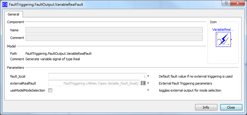 The fault model can be configured by the user (see Figure 3). Unlike the Parameter Fault where only the default value can be set, it is possible to set the record externalRealFault (see Figure 4). In this record three parameters must be set; The boolean externalFaultOn is used to switch the input from the global Faulttriggering on or off. This makes it possible to use the predefined default value without using the global model. The optional integer paramter faultMode can be used by advanced users to automatically reconfigure models. This reconfiguration is handled in the chapter Automatic Model Reconfiguration. In the "advanced" tab the parameter faultIndex, which indicates which output channel of the global model FaultTrigger is used. This should not be set by the user unless for debugging purposes or experienced users.