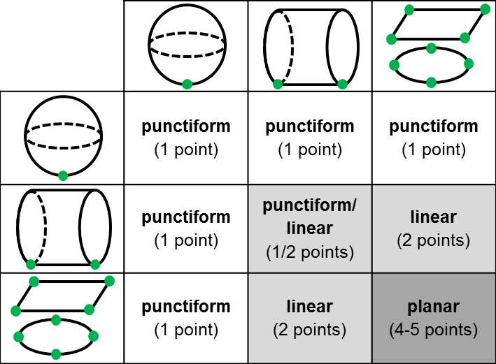 To describe elementary contact surfaces, the library provides ready-to-use blocks. The surface definition represents a thin and massless layer, which can be connected to any kind of rigid body by a frame connector. The dimensions of the surface can be parameterized. In order to be able to use the dimensions in the contact block we introduce a new interface to connect the surface definition with a contact block. The figure shows the resulting shape of the contact area for all possible combinations, as well as the number of contact points to describe it.