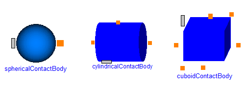 The library includes predefined, elementary bodies like cuboids or cylinders which combine several contact surfaces and include a Multibody block. Each contact surface can be enabled seperately. These do contain masses and moments of inertia, which are calculated by the dimensions and the density of the material. The Figure displays the ElementaryContactBodies that are currently available.