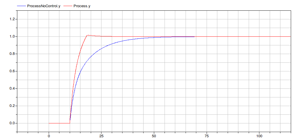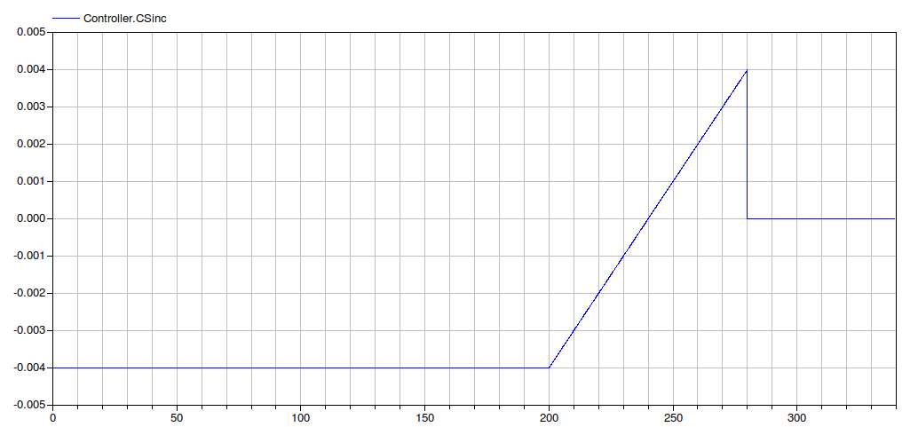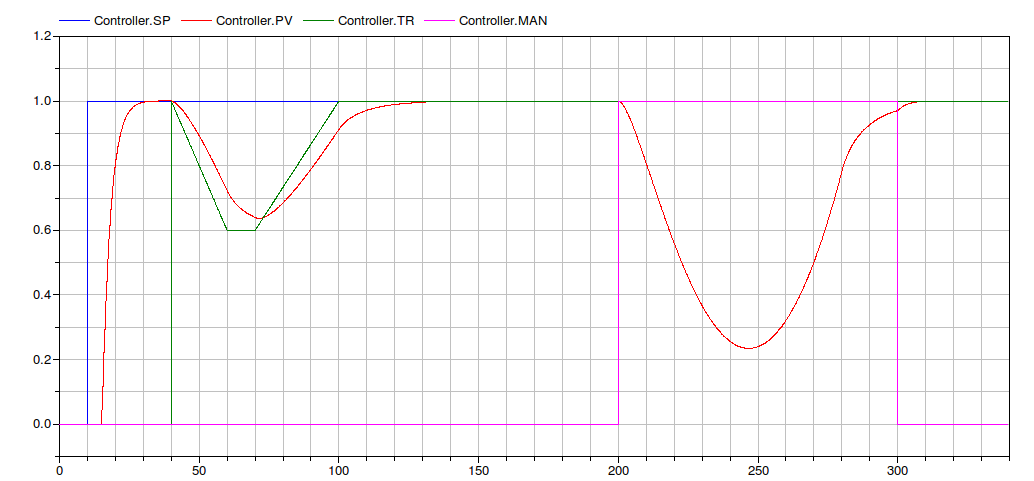 Between t = 200 and t = 300, the PID manual mode is enabled. In