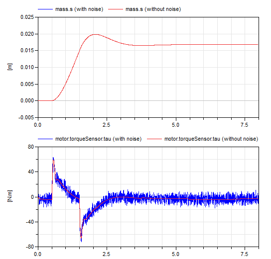 In the following figure, the position of the actuator and the motor output torque are shown with and without noise. The noise is not very strong, such that it has no visible effect on the position of the actuator. The effect of the noise can be seen in the motor torque.