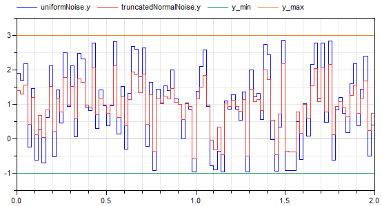 This example demonstrates different noise distributions methods that can be selected for a Noise block. Both noise blocks use samplePeriod = 0.02 s, y_min=-1, y_max=3, and have identical fixedLocalSeed. This means that the same random numbers are drawn for the blocks. However, the random numbers are differently transformed according to the selected distributions (uniform and truncated normal distribution), and therefore the blocks have different output values. Simulation results are shown in the next diagram: