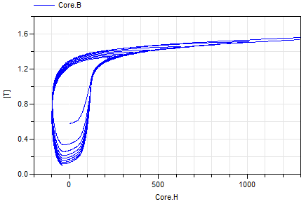 Then plot the flux density of the Core Core.B over the magnetic field strength Core.H and additionally the time course of the primary and secondary current and e.g. the power consumption of the iron core Core.LossPower (see the following figures).