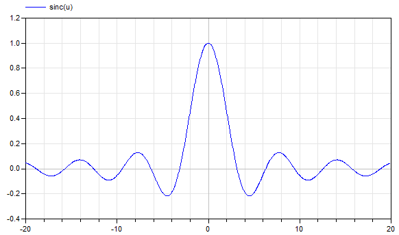 function sinc extends Modelica.Icons.Function; input Real u "Input argument"; output Real y "= sinc(u) = sin(u)/u"; end sinc;