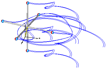 This model demonstrates the usage of model Parts.PointMass in a point gravity field. 6 point masses are connected rigidly together. Translating such a model results in an error, because point masses do not define an orientation object. The example demonstrates that in such a case (when the orientation object is not defined by an object that is connected to a point mass), a "MultiBody.Joints.FreeMotion" joint has to be used, to define the degrees of freedom of this structure.