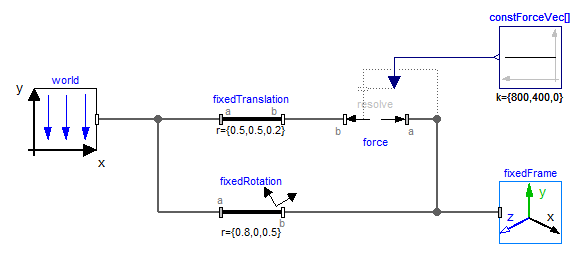 The 3 signals of the force connector are interpreted as the x-, y- and z-coordinates of a force acting at the frame connector to which frame_b of this component is attached. Via parameter resolveInFrame it is defined, in which frame these coordinates shall be resolved: