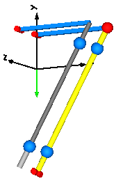The animation view at time = 0 is shown in the next figure. The system on the left side in the front is the animation with the LineForceWithTwoMasses component whereas the system on the right side in the back is the animation with the JointUPS component. Both implementations yield the same result. However, the implementation with the LineForceWithTwoMasses component is simpler.