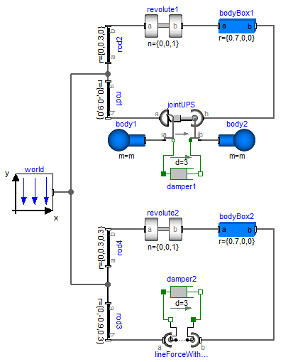 In example MultiBody.Examples.Elementary.LineForceWithTwoMasses the usage of this line force element is shown and is compared with an alternative implementation using a MultiBody.Joints.Assemblies.JointUPS component. The composition diagram of this example is displayed in the figure below.