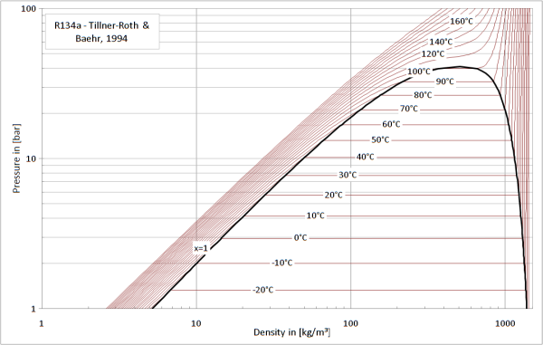 This function calculates the density of R134a from the state variables p (absolute pressure) and h (specific enthalpy). The density is modelled by the fundamental equation of state of Tillner-Roth and Baehr (1994).