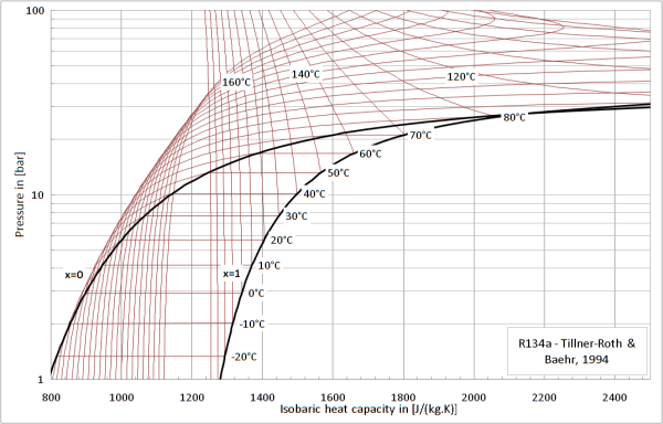 This function calculates the specific heat capacity of R134a at constant pressure from the state record (e.g., use setState_phX function for input). The specific heat capacity is modelled by the fundamental equation of state of Tillner-Roth and Baehr (1994).