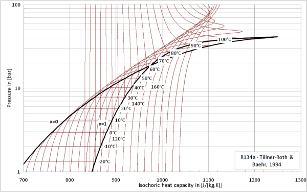 This function calculates the specific heat capacity of R134a at constant volume from the state record (e.g., use setState_phX function for input). The specific heat capacity is modelled by the fundamental equation of state of Tillner-Roth and Baehr (1994).