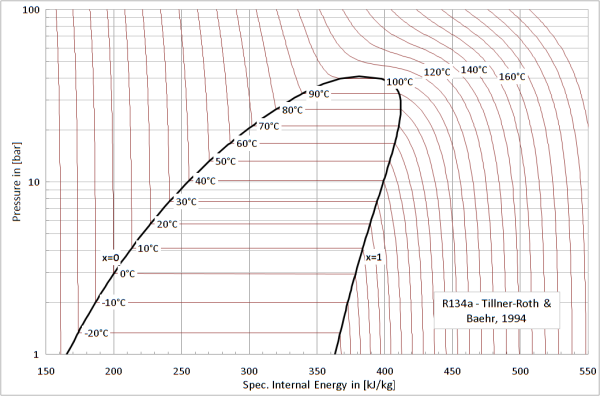 This function calculates the specific internal energy of R134a from the state record (e.g., use setState_phX function for input). The specific internal energy is modelled by the fundamental equation of state of Tillner-Roth and Baehr (1994).