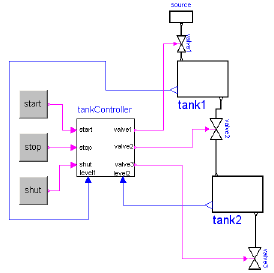 A typical model generated with this library is shown in the next figure where on the left hand side a two-tank system with a tank controller and on the right hand side the top-level part of the tank controller as a StateGraph is shown: