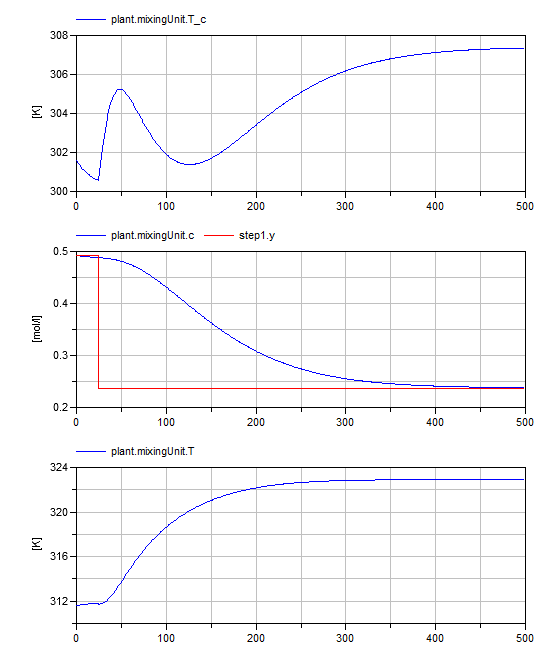 This example demonstrates the usage of the control structure template BaseClasses.TwoDOFinverseModelController to control a system by using of an inverse system model in the forward path. The controlled system is a mixing unit described in [1]. See also model of MixingUnit1 for more details.