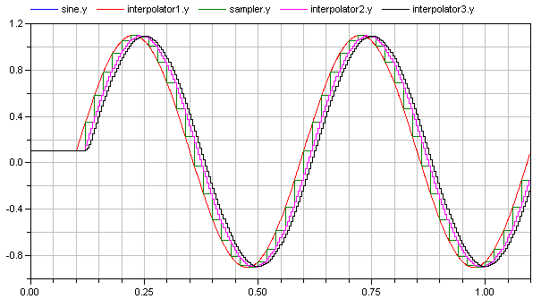 This block is demonstrated with example Examples.Interpolator leading to the following result when filtering a sine-signal with "continuous" (interpolator1.y), "discrete, unfiltered" (interpolator2.y) and "discrete, filtered" (interpolator3.y) Interpolator: