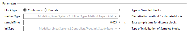 Block SampleClock defines options for all components of the Controllers library that are on the same or on a lower level as the sampleClock component. In every block, the default defined in SampleClock can be changed. The following options are available: