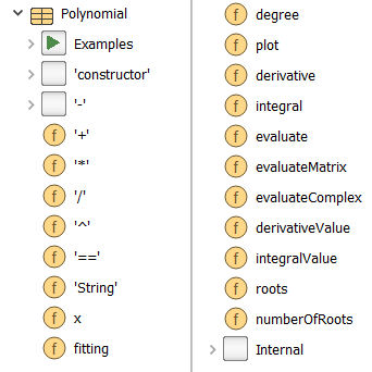 Polynomials with real coefficients are defined via record Modelica_LinearSystems2.Math.Polynomial. Read first the previous section about Complex numbers to understand how records, functions in records and the coming operator overloading technique works. The Polynomial record is equivalent to the Complex record. A screenshot is shown in the next figure: