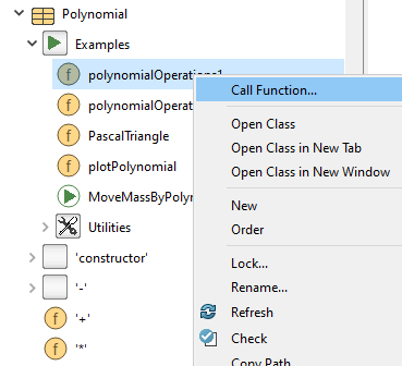 Several other examples of Polynomial are available in Polynomial.Examples. In Dymola, select the function with the right mouse button and click "Ok" on the resulting menu which provides the possibility to define all the input arguments. Since the Examples function do not have any input arguments, only the "Ok" button is present: