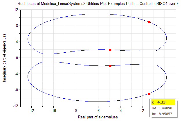 This function plots the root locus of model Plot.Examples.Utilities.ControlledSISO1 over the controller gain k (the menu on the right lower part is displayed when moving the cursor on one curve point; then all points belonging to the same parameter value are marked with a red square):