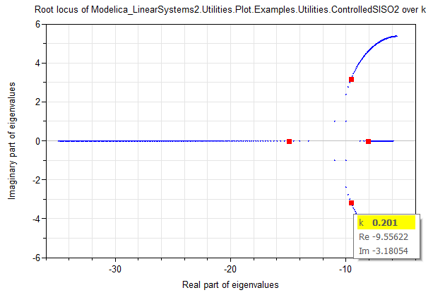 This function plots the root locus of model Plot.Examples.Utilities.ControlledSISO2 over the controller gain k with an equidistant gridding in k (the menu on the right lower part is displayed when moving the cursor on one curve point; then all points belonging to the same parameter value are marked with a red square):