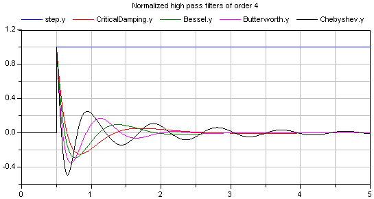 Obviously, the frequency responses give a somewhat wrong impression of the filter characteristics: Although Butterworth and Chebyshev filters have a significantly steeper magnitude as the CriticalDamping and Bessel filters, the step responses of the latter ones are much better. This means for example, that a CriticalDamping or a Bessel filter should be selected, if a filter is mainly used to make a non-linear inverse model realizable.
