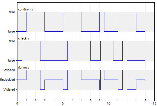 In every duration where the Boolean input condition is true, the Boolean input check must be true. During a true condition phase, property output y = Satisfied if check = true, and Violated if check = false. During a false condition phase, property output y = Undecided.