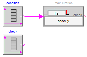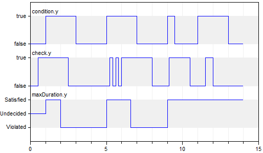 In every duration where the Boolean input condition is true, the Boolean input check must be true for at most the time span defined by parameter durationMax. Whenever this property is fulfilled, property output y = Satisfied. If this property is not fulfilled during a true condition phase, property output y = Violated. If condition=false during initialization, property output y = Undecided. Output y keeps its value, until one of the above conditions occur.