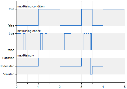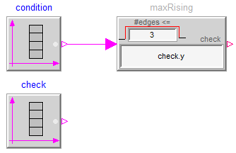 In every duration where the Boolean input condition is true, the number of rising edges of the Boolean input check is not allowed to exceed parameter nRisingMax. The default for nRisingMax=1 (so at most one rising edge). Property output y is initialized to Undecided if condition=false, and is initialized to Satisfied if condition=true. When condition becomes true (so entering a duration), property output y = Satisfied, as long as the number of rising edges ≤ nRisingMax. If condition is true and the number of rising edges > nRisingMax, output y = Violated. If condition is false, output y = Undecided.