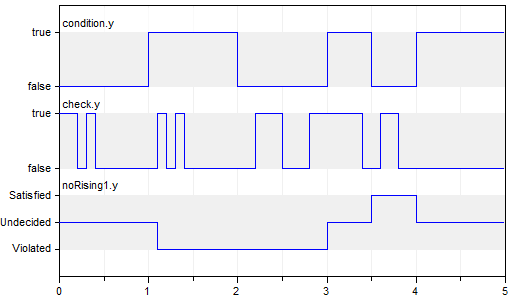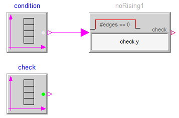 In every duration where the Boolean input condition is true, the Boolean input check must not have any rising edges. Property output y is initialized to Undecided. When condition becomes true (so entering a duration), property output y = Undecided until either check has a rising edge in this duration, then y = Violated, or the condition becomes false without any rising edge of check, then y = Satisfied.