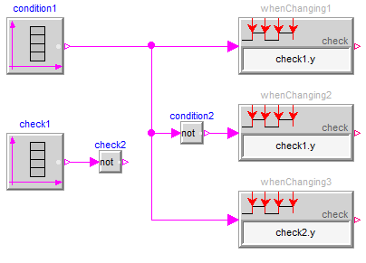 At the time instants where condition has a changing edge, property is set to "BooleanToProperty(check)" (so either Satisfied or Violated) and keeps this value until the next changing edge. At initialization, property = Undecided, independently of the value of condition.