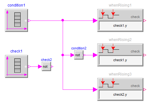At the time instants where condition has a rising edge, property is set to "BooleanToProperty(check)" (so either Satisfied or Violated) and keeps this value until the next rising edge. Before the first rising edge, property = Undecided. If condition = true during initialization, property = toProperty(check) at initialization.