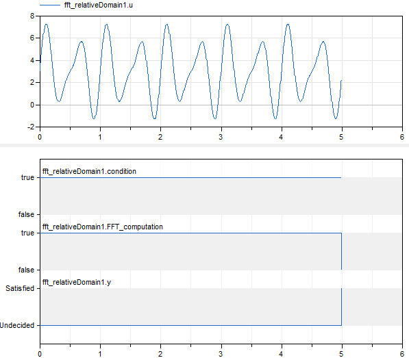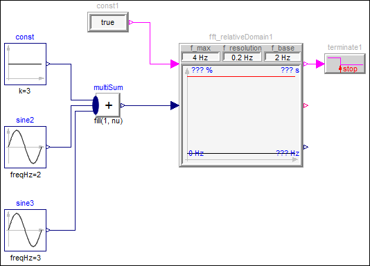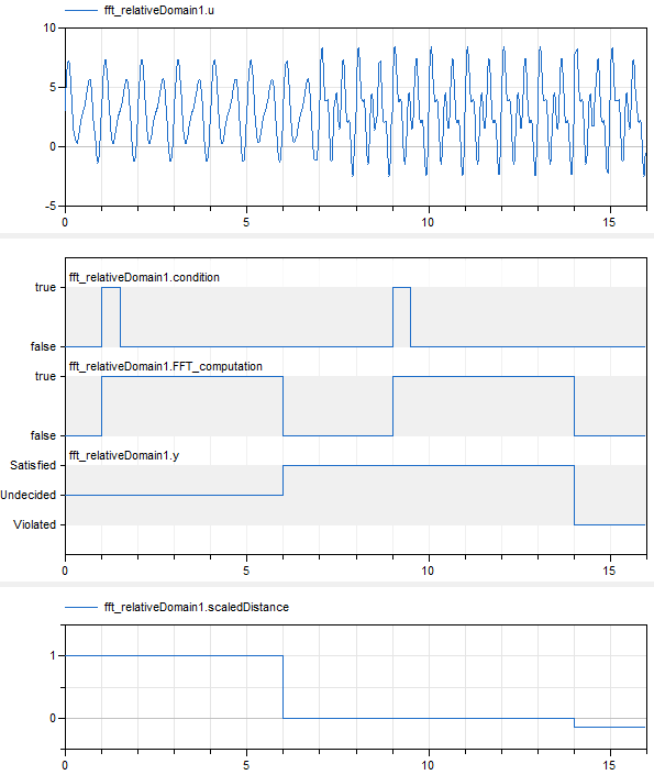 As can be seen, the simulation is terminate (via instance terminate1 of block FallingEdgeTerminate) once the FFT has been computed (signaled via the falling edge of FFT_computation). Since all FFT amplitudes between 0 ≤ f ≤ min(f_max, maxAmplitude[end,1]) are below the maximally allowed limit, the block returns Property.Satisfied.