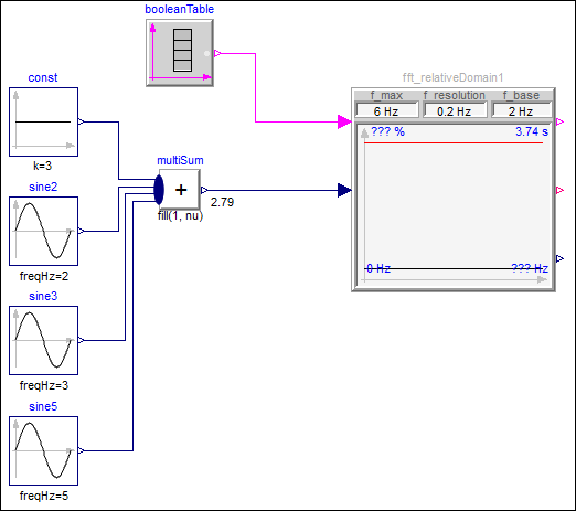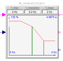 The amplitutes of the FFT are dynamically displayed in the icon of the block (in black), as well as the maximume amplitudes maxAmplitude (in red). The computed amplitude of the base frequency is shown in green (so this amplitude is 100 %)