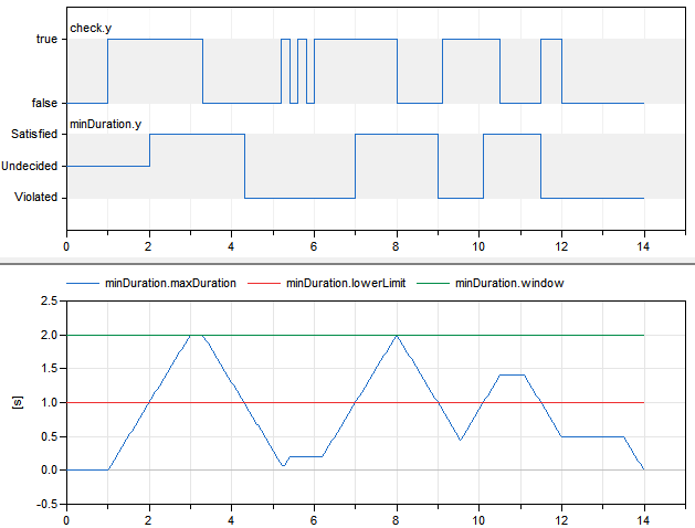 In any (sliding) time window of length window, the longest time duration where the Boolean input check was permanently true (= maxDuration) must be ≥ parameter lowerLimit. Whenever this property is fulfilled, Property output y = Satisfied. If this property is not fulfilled at the end of a sliding time window, y = Violated (exception: before the end of the first time window, y = Undecided):