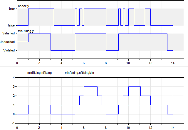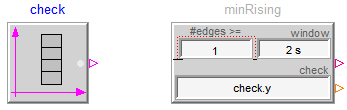 In any (sliding) time window of length window, the number or rising edges of the Boolean input check (= nRising) must be ≥ parameter nRisingMin. Whenever this property is fulfilled, Property output y = Satisfied. If this property is not fulfilled at the end of a sliding time window, Property output y = Violated (exception: before the end of the first time window, y = Undecided):