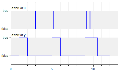 Output y = true, after a rising edge of the input u for the defined duration (if a previous duration was not yet completed, it is implicitely canceled by a new rising edge of u; this has the effect to make the y=true phase longer; see time = 7 s - 9.5 s in the example below). Otherwise, y = false. If u = true at initialization, y = true for the defined duration.