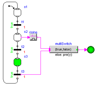 The RisingEdge, FallingEdge and ChangingEdge, components can be used to generate "pulse" signals depending on the rising, falling or changing values of a Boolean signal. An example is shown in the Figure below where the Boolean indicator lamp is turned on when Step s2 becomes active and is turned off when Transition t3 fires and Step s3 becomes inactive. Two variants are shown to utilize the "rising" property of a Boolean signal: The Boolean connectors at Steps and Transitions can be activated via parameters "use_activePort" and "use_firePort", respectively. If s2 becomes active, rising = true and therefore multiSwitch.y = true. If transition t3 fires, t3.firePort=true and therefore multiSwitch.y = false.