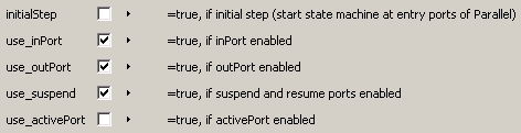 By default, a Parallel component does not have any outside ports. To achieve the StateGraph2 above, parameters use_inPort, use_outPort, and use_suspend have to be set to true, see next Figure:
