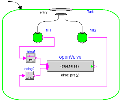In the Figure below an artifical example is shown how to handle such problems in a StateGraph2 model, e.g., with a MultiSwitch action block "openValve". The purpose is to set: