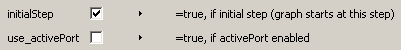 Steps represent the possible states a StateGraph2 can have. If a Step is active the Boolean variable active of the Step is true. If it is deactivated, active = false. At the initial time, all "usual" Steps are deactivated. The inital Step objects are Steps that are activated at the initial time. They are characterized by a small arrow pointing to the Step (see Figure above) and are defined by setting parameter "initialStep = true" in a Step, see next Figure.