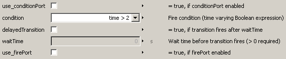 In the input field "condition", any type of time varying Boolean expression can be given (in Modelica notation, this is a modification of the time varying variable condition). Whenever this condition is true, the Transition can fire. Additionally, it is possible to activate a timer, via delayedTransition (see menu above) and provide a waitTime. In this case the firing of the Transition is delayed according to the provided waitTime, provided that the condition remains true and the preceding Step remains active during the entire waitTime. The Transition condition and the waitTime are displayed in the Transition icon.