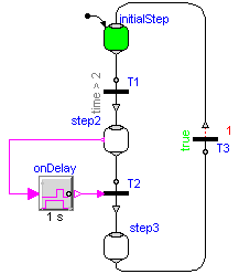 In the above example, the simulation starts at initialStep. After 2 seconds, Transition T1 fires and Step2 becomes active. After another second Transition T2 fires and Step3 becomes active. After an additional second Transition T3 fires and intialStep becomes active. Since time >2, T1 fires at once and Step2 becomes active again, and so on.