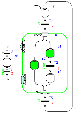 In order to construct a new state machine, exactly one instance of either "Step" or of "Parallel" must have parameter "initialStep = true". The "Parallel" component is both used as "composite step" (so only one branch), as well as "parallel step" (so several execution branches). The branches can be synchronized (if parameter use_outPort = true) or can run unsynchronized to each other (if parameter use_outPort = false).