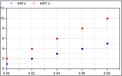 At every clock tick (that is every 20ms) the output of the unitDelay1 block is incremented by one and that of the unitDelay2 block is incremented by two. The vector size of the input and output is provided by parameter n=2 which is also shown in the icon of block assignClock1.