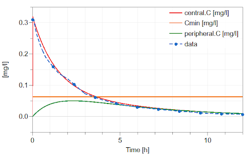 Pharmacokinetic of Midazolam administered - 2-compartment model example with parameter values, dosage 9.6 mg administered intravenously with bioavailability 1.